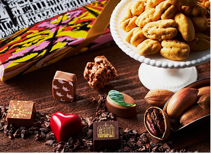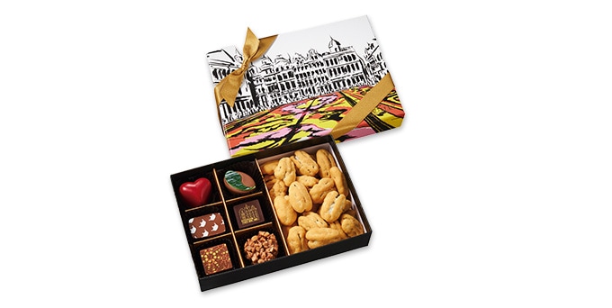 ベルギーのグランプラス広場とフラワーカーペットをモチーフにした化粧箱に、定番人気のペカンナッツショコラと職人がひとつひとつ丁寧に手作りしているトリュフを詰め合わせた、グランプラスのスペシャリテ。